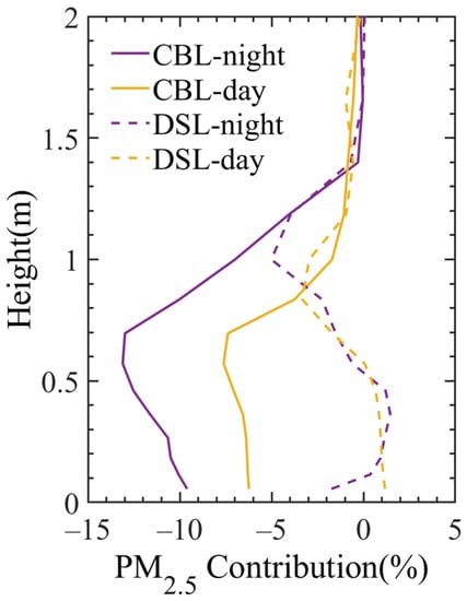Vertical distribution of PM2.5 contribution differences (%) between the lake experiment and no-lake experiment averaged for CBLs and DSLs below 2 km in the atmosphere during the air pollution process of 19–22 January 2018. The yellow and purple lines represent the daytime at 14:00 (local time) and the nighttime at 02:00 (local time).