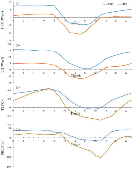Diurnal variations in differences of (a) sensible heat flux (HFX, W/m2), (b) latent heat flux (LH, W/m2), (c) 2-m air temperature (T2, °C), and (d) planetary boundary layer height (PBLH, m) between the simulations of the lake experiment and no-lake experiment averaged for CBLs and DSLs during the air pollution process from 19–22 January 2018.
