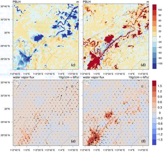 Spatial differences of (a,c,e) daytime (14:00 local time) and (b,d,f) nighttime (02:00 local time) (a,b) 2 m temperature, (c,d) atmospheric boundary layer height, and (e,f) water vapor flux transport in the horizontal direction between the lake experiment and no-lake experiment during the air pollution process from 19–22 January 2018.