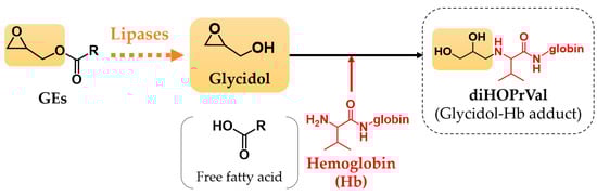 Glycidyl fatty acid esters (GEs) are process contaminants formed mainly in the deodorization step under the high temperature conditions of the refining process of edible oil []. GEs, which have fatty acid in their structure, are degraded by lipase, a lipolytic enzyme, consequently producing glycidol (2,3-epoxy-1-propanol) when ingested by the body through the diet (Figure 1) []. Glycidol is known as a genotoxic epoxide compound and has been reported to induce carcinogenicity [,,], chromosomal aberration induction, neurotoxicity, and mutagenicity [,,,]. In view of the genotoxic and carcinogenic potential of glycidol, it is important to assess the exposure of GEs to humans from the food and environment for public health perspective. N-(2,3-dihydroxypropyl)valine (diHOPrVal) is a hemoglobin (Hb) adduct of glycidol, which has been reported as an important external exposure marker for GEs [,,,]. The Hb adduct of glycidol is formed by the binding of glycidol to the N-terminal valine of the Hb structure (Figure 1) []. Honda et al. reported no significant increase in diHOPrVal levels among subjects who have ingested diacylglycerol (DAG) oil containing high levels of GEs [,]. This finding indicates that humans are exposed to GEs from sources other than DAG oil. Besides being food contaminants found at highest levels in refined vegetable oils and fats, GEs are found in cooked meat and fish [], as well as prepared foods such as instant noodles, fried chicken, and fried confectionery as new sources []. In particular, high concentrations of GEs were detected in meat cooked on charcoal that can be heat treated at high temperatures. Landin et al. found that animals fed fried animal feed for 30 or 72 days showed an increase in diHOPrVal level by about 50% compared with controls []. Therefore, heating of food affected the formation of diHOPrVal. However, few human studies have measured adduct levels after ingesting foods containing GEs treated at high temperatures.