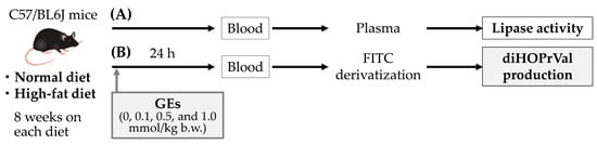 Procedures for animal experiments. (A) Lipase activity in plasma was measured in five normal diet and five high-fat diet groups. (B) Five normal diet and five high-fat diet groups were treated with 0, 0.1, 0.5, and 1.0 mg/kg b.w. of glycidyl fatty acid esters (GEs). Twenty-four hours after GEs administration, blood was drawn. After solid-phase extraction of blood samples, blood was derivatized using fluorescein isothiocyanate (FITC), and then diHOPrVal levels were measured by LC–MS/MS.