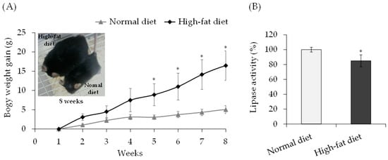 Lipase activity in mice fed a high-fat diet. (A) Body weight changes in mice fed normal and high-fat diets. (B) Comparison of lipase activity in mice fed normal and high-fat diets. The values represent the mean ± standard deviation (SD) of five independent experiments on five mice. * The significance level was p < 0.05 compared with normal diet.