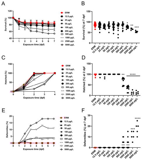 Percentage survival, deformities, and hatch rate of zebrafish exposed to ERM (control), 12.5, 25, 50, 100, 200, 500, 1000, 2500, and 5000 µg/L of sulfamethoxazole over time (A,C,E). Percent survival and deformities at 7 dpf and hatch rate at 2 dpf of zebrafish embryos ((B,D,F), respectively). Four separate experiments were performed, and data were merged into single graphs for all three parameters. The horizontal line represents the group’s median value (Kruskal Wallis followed by Dunn’s multiple comparison test, * p < 0.05, ** p < 0.01, *** p < 0.001, **** p < 0.0001).