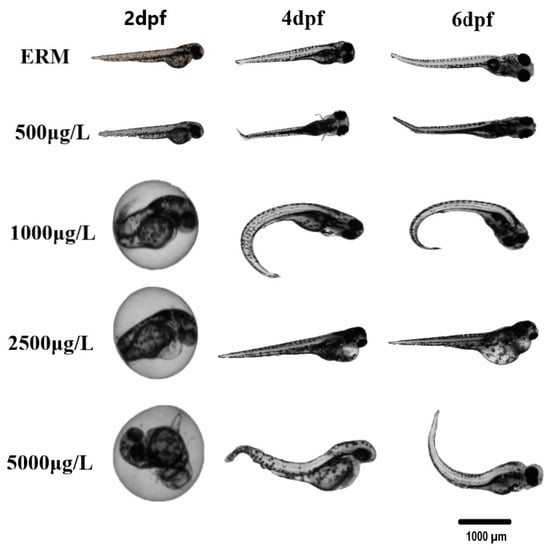 Selected photomicrographs of morphological deformities observed in zebrafish embryos/larvae at 2, 4, and 6 dpf after being exposed to one concentration of 500, 1000, 2500, and 5000 µg/L sulfamethoxazole and ERM (control). The scale bar is 1000 µm. Most of the deformities/malformations were observed at higher concentrations tested. Predominant deformities were yolk sac edema, pericardial effusion, bent tail, and curved spine.