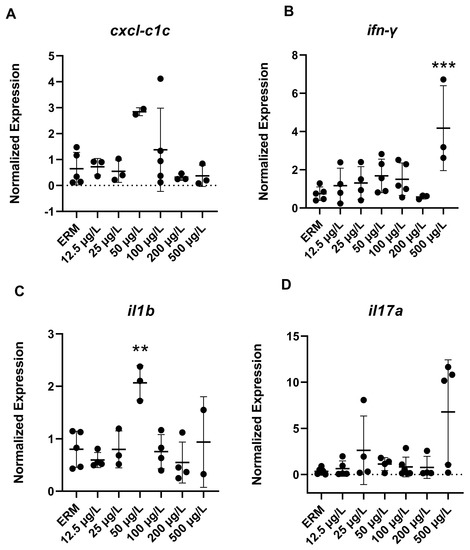 Transcript levels of immune system: (A) chemokine cxcl-c1c; (B) interferon gamma, ifn-γ; (C) Interleukin-1beta, il-1b; (D) Interleukin-17A, il-17 in 7 dpf zebrafish larvae exposed to sulfamethoxazole. Data are represented as mean (±SD). One-way ANOVA followed by Dunnett’s post-hoc test, ** p ≤ 0.01, *** p ≤ 0.001, n = 3–5 biological replicates/treatment.