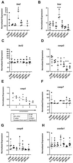 Transcript levels of apoptosis: (A) Bcl2 associated agonist of cell death, bad; (B) Bcl2 associated x, apoptosis regulator, bax; (C) Bcl2 apoptosis regulator, bcl2; (D) Caspase 3a, casp3a (E) Linear regression of caspase 3a, casp3a (F); Caspase 7, casp7 (G); Caspase 9, casp9 (H); Cytochrome c oxidase subunit 5Aa, cox5a1 in 7 dpf zebrafish larvae exposed to sulfamethoxazole. Data represented as mean (±SD). One-way ANOVA followed by Dunnett’s post-hoc test, * p ≤ 0.05, ** p ≤ 0.01, *** p ≤ 0.001, n = 3–5 biological replicates/treatment.