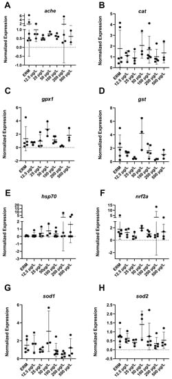 Transcript levels of oxidative stress: (A) acetylcholinesterase, ache; (B) catalase, cat; (C) glutathione peroxidase 1, gpx1; (D) glutathione S-transferase, gst (E) heat shock protein 70, hsp70; (F) nuclear factor erythroid 2-related factor 2, nrf2a; (G) superoxide dismutase 1, sod1; (H) superoxide dismutase 2, sod2 in 7 dpf zebrafish larvae exposed to sulfamethoxazole. Data represented as mean (±SD). One-way ANOVA followed by Dunnett’s post-hoc test, p > 0.05, n = 3–5 biological replicates/treatment.