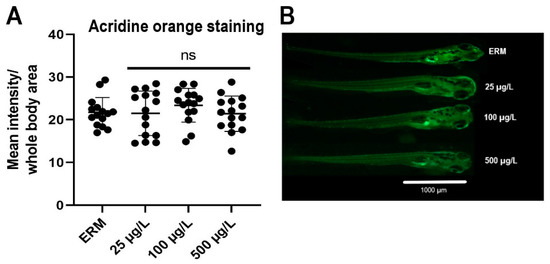 (A) Fluorescence intensity (quantified by using the histogram tool of the Image J software) in zebrafish larvae exposed to ERM (control), 25, 100, and 500 µg/L sulfamethoxazole at 7 dpf. Data represented as mean (±SD) (one-way ANOVA followed by Dunnett’s post-hoc test, p > 0.05, n = 15 larvae per treatment). (B) Representative photomicrographs of zebrafish larvae stained with acridine orange (AO) dye after being exposed to ERM (control), 25, 100, and 500 µg/L sulfamethoxazole for 7 days. The scale bar is 1000 µm. The abbreviation ns indicates not significant.