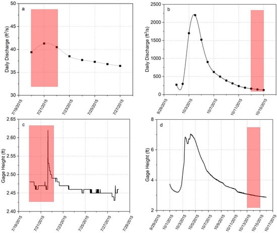 USGS stream flow and height data for South River in 2015: (a) stream flow during baseline condition (July 2015), (b) stre.am flow during drainage condition (October 2015), (c) stream height during baseline condition (July 2015), (d) stream height during drainage condition (October 2015).