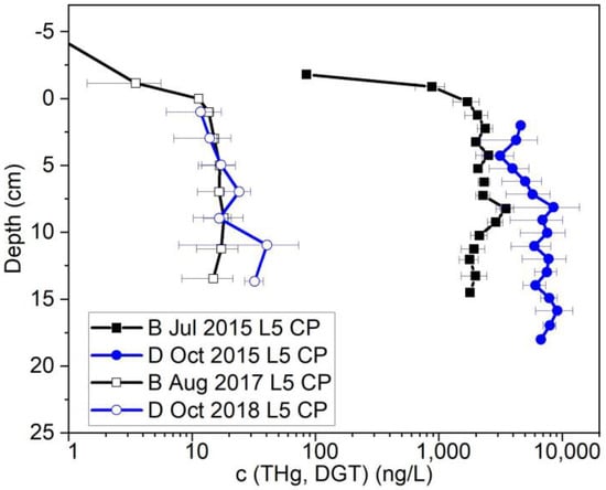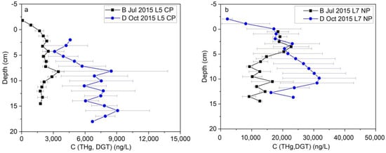(a) Porewater THg concentration measured with DGT at L5 (Constitution Park) during Baseline (B) (July 2015) and Drainage (D) (October 2015); (b) porewater THg concentration measured with DGT at L7 (North Park) during Baseline (B) (July 2015) and Drainage (D) (October 2015); on the y-axis, 0 represents the water/sediment interface and the negative numbers refer to distances above the interface (i.e., in the water column).