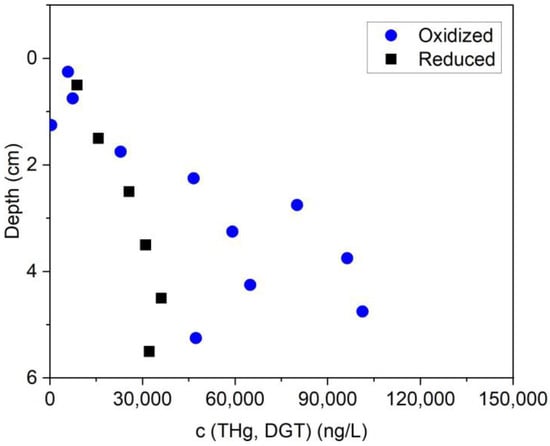 The mesocosm THg results are shown in (Figure 6). Oxygen decreased to 0 within 2 cm of the surface of the mesocosm and conditions were anoxic throughout most of the mesocosm sediments (Figure S1). THg concentration in the anoxic sediment porewaters was between 25 and 36 µg/L. After the introduction of oxic water simulating inundation, the THg concentration in the interstitial water increased to 45–100 µg/L or 2–3 times greater.