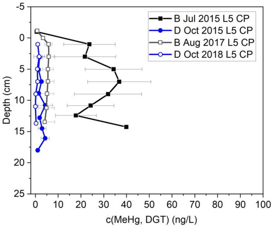 Porewater MeHg concentration measured by DGT in L5 at Constitution Park during sampling events before and after bank stabilization and during baseline (B) and drainage (D); on the y-axis, 0 represents the water/sediment interface and the negative numbers refer to distances above the interface (i.e., in the water column).