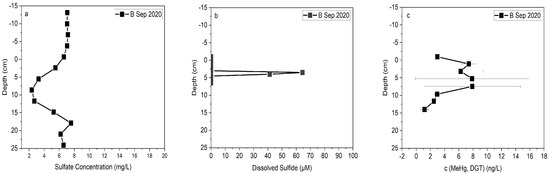 (a) Sulfate concentration, (b) dissolved sulfide concentration, and (c) MeHg concentration, profiles in L5 at Constitution Park (2020); on the y-axis, 0 represents the water/sediment interface and the negative numbers refer to distances above the interface (i.e., in the water column).