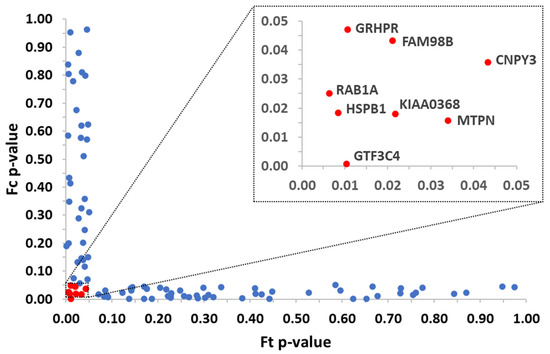 For each protein, the abundance was normalized on the average value for the control condition, and then Ft and Fc were calculated as described. Two-tailed Student’s t-test (with equal or unequal variance depending on F-test) was applied to calculate p-values. Proteins with p-values < 0.05 for both Ft and Fc were considered protein targets, meaning to be the proteins’ combined solubility alteration with action at a low compound concentration [12]. The data were represented in a scatter plot combining Ft and Fc p-values, to facilitate the visualization of the protein targets.