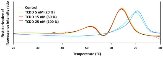 Besides, one identified protein target was selected to perform the protein-chemical binding validation through the assessment of differential scanning fluorimetry with a nanoDSF device. NanoDSF is based on the changes in the intrinsic tryptophan fluorescence (ITF) resulting from alterations of the 3D structure of proteins, when proteins unfold, as a function of the temperature. Therefore, a melting temperature (Tm) can be determined [26]. Monitoring of the ITF at 330 nm and 350 nm during protein thermal denaturation was carried out in a Prometheus NT.48 instrument from NanoTemper Technologies (Munchen, Germany) with an excitation wavelength of 280 nm. Excitation power was set at 25%. Capillaries were filled with 10 μL of a solution containing the protein and TCDD, placed into the sample holder, and a temperature gradient of 0.5 °C/min from 20 °C to 80 °C was applied. The ratio of the recorded emission intensities (Em350 nm/Em330 nm), which represents the change in tryptophan fluorescence intensity was plotted as a function of the temperature. The fluorescence intensity ratio and its first derivative were calculated with the manufacturer’s software (PR.ThermControl, version 2.3.1 from NanoTemper Technologies). For validating protein-chemical binding, the purified protein was mixed with 3 different concentrations of TCDD. The tested compound concentrations were 5 nM (20%), 15 nM (60%), and 25 nM (100%). The protein’s final concentration was 0.5 mg/mL. Control was performed with purified protein in PBS and DMSO maintaining the corresponding protein concentration as for the TCDD. Three replicates were carried out for each condition. Selection of the protein target for validation was based on the availability on the market (full-length recombinant protein and without GST tag, due to possible interferences with chemical binding) and the number of tryptophan residues (at least 2).