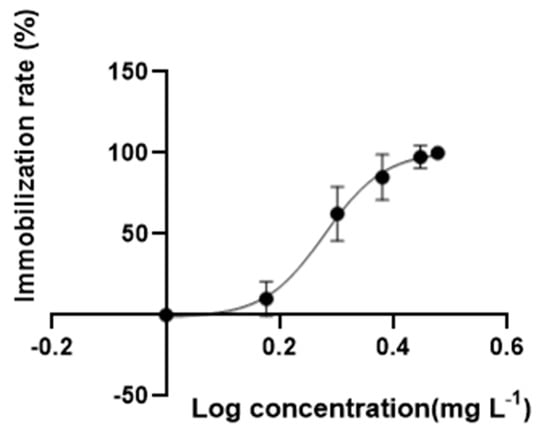 Referring to the OECD 202 guideline for daphnid, acute immobilization test [25], acute toxicity tests was conducted to study the reference toxicant (potassium dichromate) and DES. Using the range-finding method to assess the EC50, the DES experimental concentration was determined to be 1, 1.5, 2, 2.4, 2.8, and 3 mg·L−1 (four replicates per concentration), and 10 mg·L−1 stock solution was prepared with M4 medium applied for an acute test. During the experiment, test neonates (<24 h) were not fed and per replicate consisted of five neonates. After exposure for 48 h, the immobilized neonates were counted to draw a concentration–response curve to then calculate the 48 h EC50.