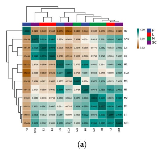 A total of 13,137 transcripts were examined in D. magna in all treatments. With regard to gene expression patterns, a correlation coefficient no less than 0.93 was detected among the replications in each treatment, demonstrating a high co-correlation between samples (Figure 3a). In the PCA analysis (Figure S2), gene expression showed a resemblance to low treatments and solvent control treatments, while the medium and high treatment differed from the solvent control treatment, indicating that DES at medium to high levels may result in hazardous effects that are consistent with the results in heatmaps (Figure 3b).