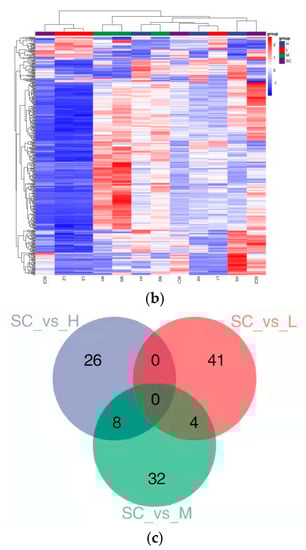 Transcriptomic profiles of D. magna after 9 d exposure to diethylstilbestrol (DES). (a) Correlation analysis of patterns of gene expression in solvent control groups and DES treatment groups; (b) a heatmap of centered and scaled FPKM value of DEGs in solvent control groups and DES treatment groups; (c) Venn diagram of the number of DEGs in each DES treatment group. SC: solvent control; L: low; M: medium; H: high.
