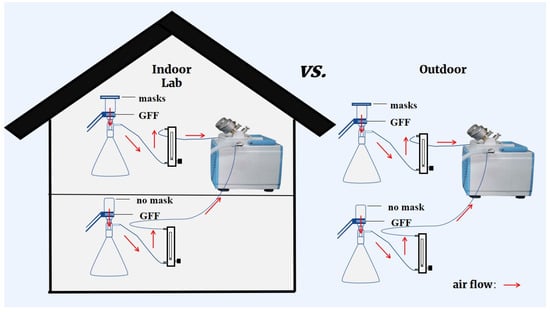 The experimental system that had been reported by Li et al. [] was adopted in the present study with minor modification. As shown in Figure 1, each experimental flow-path was composed of a mask sample, a suction flask with GFF filter, a rotermeter, and a vacuum pump. In order to simulate the human inhalation process, air was sucked through the testing mask continuously at a flow rate of 15 L/min []. A blank test collecting microplastics and phthalates without the mask fixed on top of the suction flask was also conducted at the same time to figure out the role facemasks played. This experiment was conducted indoors and outdoors, and no contamination control measures of sampling environments were applied to reflect a realistic situation of microplastics and phthalate diester inhalation (Figure 1).