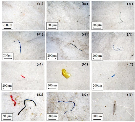 Microplastics detected on GFFs under indoor (top, (a1–f1)) and outdoor (bottom, (a2–f2)) conditions. (a–f): activated-carbon mask (AC), N95 mask (N95), surgical mask (SU), cotton mask (CO), fashion mask (FA), without mask (AIR), respectively.