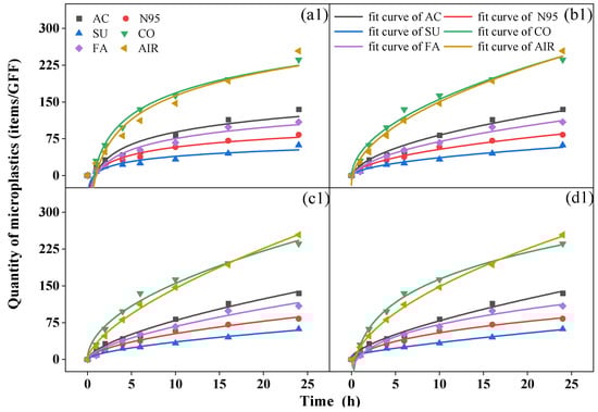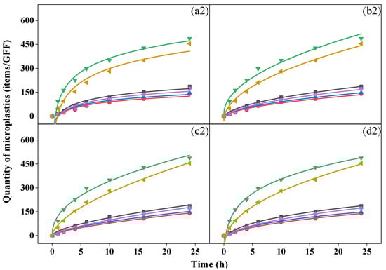 During the 24 h period, a biphasic release pattern was observed with rapid release in the first six hours, followed by slower release indoors and outdoors. Although it could not be precisely determined whether the microplastics collected came from the mask or the atmosphere, the variations in the quantity over time were similar to the release trend of the microplastics in the water environment of the mask. Similar equations (Equations (3)–(6)) can be used to fit the dynamic characteristics [,] (Figure 3).