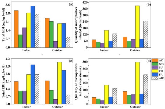 Total estimated daily intake of phthalates (a,c) and quantity of microplastics inhaled (b,d) by an adult while wearing activated-carbon mask (AC), N95 mask (N95), surgical mask (SU), cotton mask (CO), fashion mask (FA), and wearing no mask (AIR) in indoor and outdoor conditions. (a,b) simulated the condition in which the mask was changed after 4 h and kept for later 2 h, while (c,d) were based on the mass of phthalates and number of microplastics collected after 6 h.