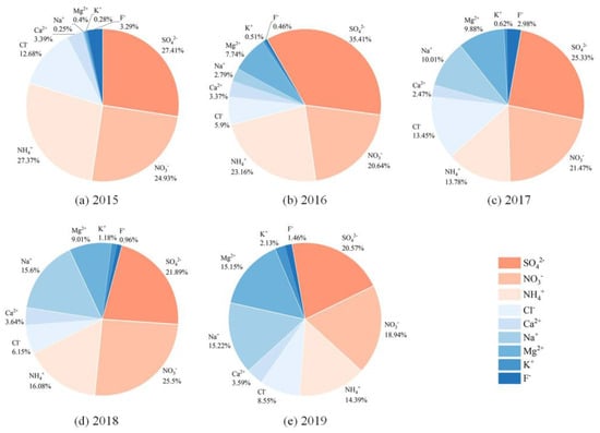 The relative proportion of each water-soluble ion in the total measured water-soluble ions. SO42−, NO3− and NH4+ were the most abundant water-soluble ions in PM2.5 in Nanjing Jiangbei New Area from 2015 to 2019.