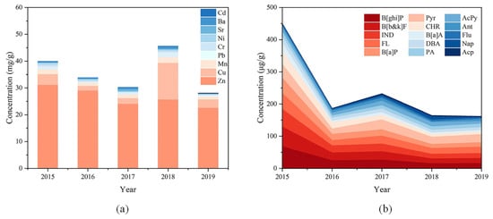 (a) Mass concentrations of heavy metal elements in PM2.5 from 2015 to 2019. The highest content of heavy metals in sampled PM2.5 was found in 2018, while the content of heavy metals decreased year by year in other years. (b) Mass concentrations of PAHs in PM2.5 from 2015 to 2019. The total PAHs concentration in general tended to decrease.