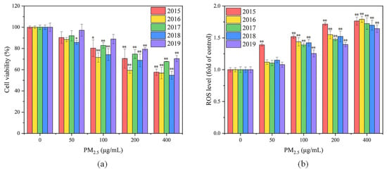 As shown in Figure 4a, the viability of GC-2spd(ts) cells in all five exposure groups decreased with increasing PM2.5 exposure concentrations. At the PM2.5 exposure concentration of 50 μg/mL, the cell viability of the exposure group was not significantly different from that of the control group. When the PM2.5 concentration was increased to 100–200 μg/mL, the cell survival rates of the exposure groups varied significantly from the control group. The highest cytotoxicity of PM2.5 was presented in 2016, followed by 2018, 2015, 2017 and 2019. At the exposure concentration of 400 μg/mL, the lowest and highest cell survivals were obtained in 2018 and 2019, which were 54.73% and 70.38%, respectively. A linear fit was performed for PM2.5 exposure concentration and cell viability for each year from 2015 to 2019. It was found that there was a linear negative correlation between PM2.5 exposure concentration and cell viability for each year (p < 0.05), with r2 of 0.93, 0.76, 0.88, 0.88 and 0.94, respectively, demonstrating a dose–effect relationship between PM2.5 exposure and cell viability. Similarly, a study in Beijing revealed that PM2.5 inhibited the viability of GC-2spd(ts) cells and even induced apoptosis at high exposure concentrations []. It has also been suggested that these may be due to the elevated cellular ROS level caused by PM2.5 []. Overall, the cytotoxicity of PM2.5 in 2017 and 2019 was relatively weak, whereas that in 2016 and 2018 was more able to inhibit the viability of GC-2spd(ts) cells, probably due to the differences in the chemical compositions of PM2.5 in different years. The highest SNA level in 2016 and the highest heavy metal level in 2018 may contribute to the stronger cytotoxicity of PM2.5 in these two years.