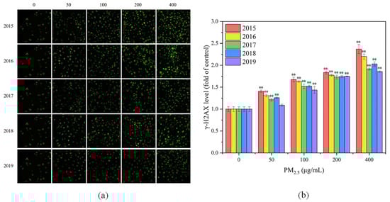 (a) Fluorescence images of γ-H2AX in GC-2spd(ts) cells after PM2.5 exposure for 24 h. From left to right, different exposure concentrations are presented for 0, 50, 100, 200 and 400 μg/mL. From top to bottom, different years for PM2.5 are presented for 2015, 2016, 2017, 2018 and 2019. Compared with the control group (0 μg/mL), all exposure groups exhibited more fluorescent spots and higher fluorescence intensity. (b) γ-H2AX levels of GC-2spd(ts) cells after PM2.5 exposure for 24 h. Compared with the control group, ** means p < 0.01.