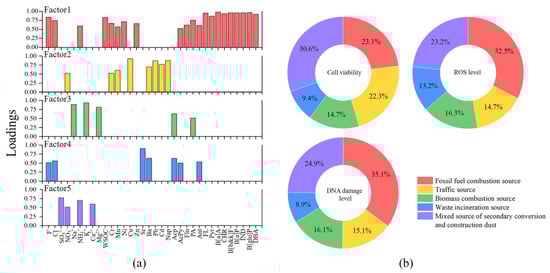 (a) Loadings of the main components of the five characteristic factors. (b) Relative contributions of the five sources to cytotoxic effects.