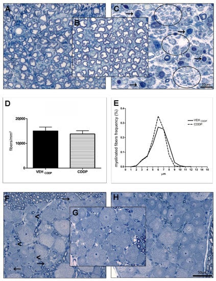 Morphological and morphometric analysis of caudal nerves and DRG. (A–C): representative images of caudal nerves at light microscopy; (A): cisplatin; (B): vehicle; (C): paclitaxel; (D,E): morphometric analysis of caudal nerves; (F–H): representative images of DRG at light microscopy; (F): cisplatin; (G): vehicle; (H): paclitaxel. Arrows and circles in (C) represent fiber degeneration and loss, respectively. Arrows and arrowheads in (F) indicate multinucleolarity and nucleolar eccentricity, respectively.