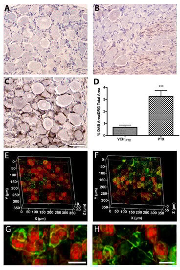 Analysis of the immunolocalization and expression of GFAP in the DRG. (A–C): immunohistochemistry analysis; (A): cisplatin; (B): vehicle; (C): paclitaxel; bar = 100 μm. (D): quantitative analysis of GFAP expression; (E–H): 3D-IF analysis (RED: IB4; GREEN: GFAP); (E): vehicle PTX; (F): paclitaxel; (G,H): magnifications from (F); bar = 25 μm. *** p < 0.0001.
