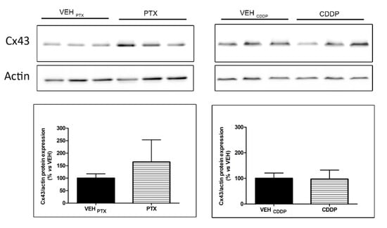 The pool of DRG of three animals/group was employed to quantify, through an immunoblotting analysis, the level of Cx43 expression. The analysis demonstrated a trend towards an increase, not statistically significant, in Cx43 expression level in DRG of animals treated with PTX, but not with CDDP (Figure 4).