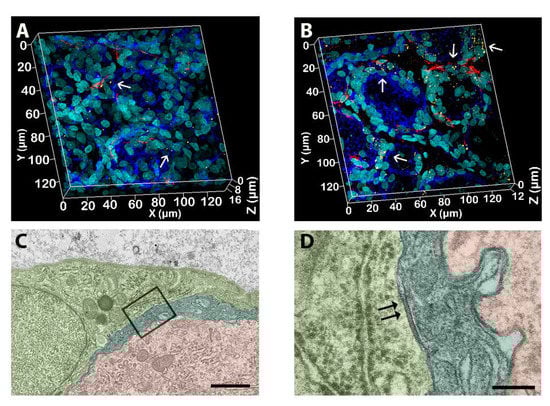 In a qualitative analysis of gap junctions, performed through 3D-IF on three DRG/animals treated with PTX and VEH PTX, Cx43 appeared to be distributed on the plasma membranes of SGCs (Figure 5A,B). Moreover, in PTX-treated DRG, this 3D approach revealed a more complete picture of the Cx43 distribution on SGCs surrounding neurons (blue). In fact, the immunostaining showed a pattern of discrete perineuronal localization of Cx43, forming spots of intense labeling only in PTX-treated DRG (arrows in Figure 5B), suggesting an increased concentration of gap junctions in certain points of the SGCs (nuclei in cyan) plasma membranes, and generally, an increased immunoreactivity to Cx43 in DRG of PTX-treated animals. The electron microscopy analysis permitted the visualization of the gap junctions, revealing no significant changes, induced by PTX, in their structure (Figure 5C,D).