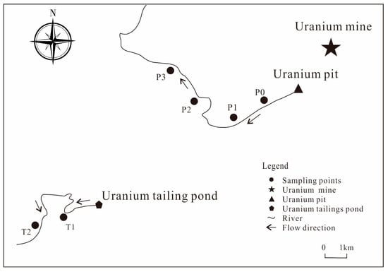 Soil samples were collected in October 2020, including the uranium pit and tailings pond, with a total of 6 sampling points (Figure 1). Approximately 1 kg of soil was collected from the 0 ~ 20 cm surface layer, and the sample was sealed and stored in a sample bag after removing the debris. Soil samples were naturally dried to remove plant residues, gravel and other debris, ground through a 200-mesh sieve according to the quadratic method and placed in a desiccator for backup. The pH value was tested according to the specification (NY/T 1377-2007). The dissolved oxygen and conductivity were measured using a 1:5 ratio of a soil sample to water, shaking for 5 min, filtering the supernatant and testing with a multiparameter analyzer (Remag DZS-708-C). The soil organic matter content was measured and calculated using NY/T 1121.6-2006 for testing and calculation []; the basic parameters of the soil samples are shown in Table 1.