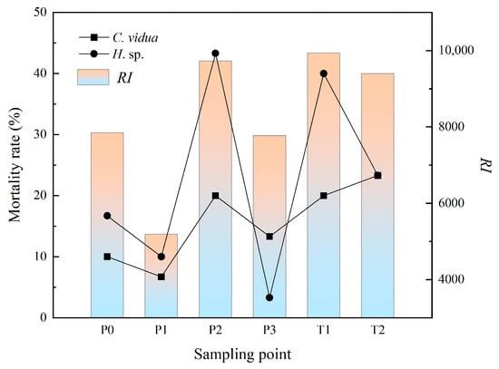 The results of the ostracod toxicity evaluation are shown in Table 9. For C. vidua, the highest mortality rate of 23.3% was recorded at sample site T2, followed by sample sites T1 and P2 with a mortality rate of 20%, and the lowest mortality rate of 6.7% was recorded at sample site P1 at the pit entrance for a 96 h termination time exposure. For H. sp., the 96 h termination time exposure had the highest mortality rate of 43.3% at the pit P2 sample site, followed by the T1 sample site with 40% and the lowest mortality rate of 3.3% at pit P3. The mortality rates of P2, T1 and T2 at the termination time of the two biological experiments were higher than those of other samples, and the potential ecological risk index of these samples was higher (Figure 3). The potential ecological risk index of P1 and P3 was obviously low, and the mortality of ostracods was also low at the two sites. The difference between the potential ecological risk index of P0 and P3 was very small, and the mortality of the C. vidua endpoint was not significant at these two sites. Still, in H. sp., the mortality rate at P0 was significantly higher than that at P3, and the results of the two biological evaluations showed specific differences here. The above analysis indicated that the results of the ostracod assessment were consistent with the results of the potential ecological risk assessment.
