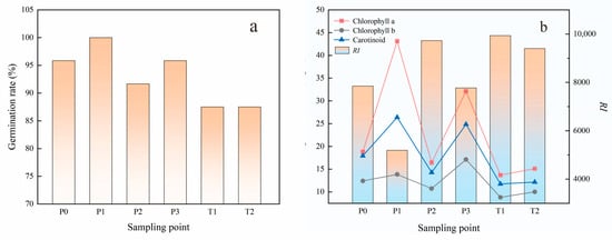 The effect of soil on Vicia faba L. seed germination differed at different points in the study area (Figure 4a). The germination rate of broad beans at T1, T2 and P2 was lower than that at the other sites, with 87.50% germination at T1 and T2, 91.67% germination at P2, 100% germination at P1 and 95.83% at the remaining sites. Heavy metals inhibit chlorophyll synthesis by inhibiting its activity. Comparing the pigment content of fava bean with the potential ecological risk index RI (Figure 4b), the results showed that the T1, T2, P2 and P0 values at risk were higher, the levels of broad bean seedling leaf chlorophyll a and chlorophyll b and carotenoid content decreased significantly, and the chlorophyll a and carotenoid content changed more significantly than chlorophyll b. The highest RI and lowest pigment content at T1 were consistent with the potential risk. The results of the evaluation were consistent with the results of the potential risk.
