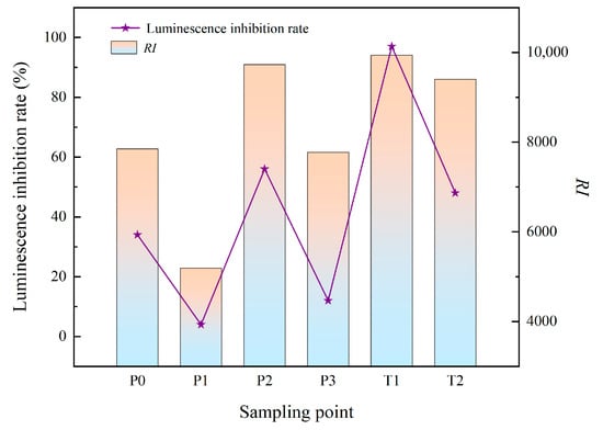 Vibrio fischeri luminescence is highly susceptible to external conditions. When luminescent bacteria come into contact with toxic and harmful substances, they affect their physiological and metabolic processes and thus cause changes in luminescence intensity, which generally tends to diminish with increasing concentrations of toxic substances. The strongest luminescence inhibition was at T1 with 97% inhibition, followed by P2 and T2 with 56% and 48% inhibition, respectively, P0 with 34% luminescence inhibition, and P1 and P3 points with 4% and 12% inhibition, respectively. The luminescence inhibition rate was compared with the potential ecological risk index and analyzed (Figure 5). The luminescence inhibition rate was significantly higher at the higher potential risk index points (T1, P2, T2, P0), with the highest RI at T1 having the most significant luminescence inhibition and the luminescence inhibition rate at P1 and P3 being significantly lower.