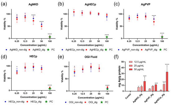 Impact of non-digested and digested Ag NMs on HCT116 cell viability. Cell viability assessed by WST-1 assay 24 h after HCT116 cells were exposed to digested and non-digested Ag NPs (a–c), as well as HEC (no Ag) (d) and OGI fluid (no NMs) (e). PC refers to the positive control, i.e., amino-modified polystyrene nanoparticles (PSNH2) used at 100 µg/mL. Ag intracellular accumulation (f). HCT116 cells were exposed for 24 h to AgNKD, AgPVP and AgHEC, and intracellular Ag content was measured using ICP-MS. Values are the mean ± SD of three independent experiments with five replicates per experiment. Statistical significance, exposed vs. control, (*) p < 0.05, (***) p < 0.001, (****) p < 0.0001.