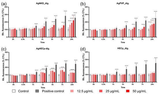 Kinetics measurements showed that ROS intracellular content progressively increased in exposed cells, with a statistically significant elevation from 3 h of exposure (AgNKD and AgHECp) or 5 h of exposure (AgPVP). At the highest concentration (50 µg/mL), AgNKD induced more ROS production than AgHECp and AgPVP. At 50 µg/mL, a statistically significant difference was found when comparing AgNKD and AgHECp (p < 0.0001) and AgPVP and AgHECp (p < 0.05). Even though the highest ROS production was observed with AgNKD, there was no significant differences between AgNKD and AgPVP at 50 µg/mL.