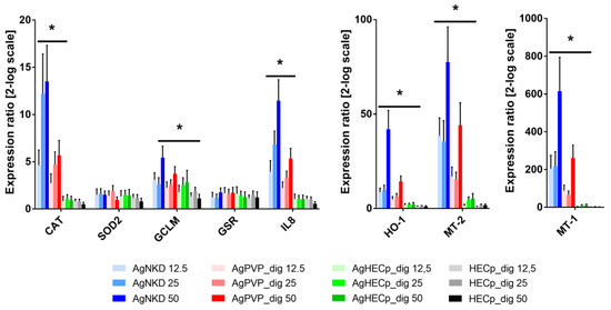 The mRNA expression analysis of HCT116 cells exposed to digested Ag NMs. RT-qPCR analysis was performed in cells exposed to 12.5, 25 or 50 µg/mL of digested AgNKD, AgPVP, AgHECp or HECp, focusing on oxidative stress markers (CAT, SOD2, GCLM, GSR, HO-1), inflammation (IL-8) and metal homeostasis (MT-1 and MT-2). Statistical significance, exposed vs. control, (*) p < 0.05.