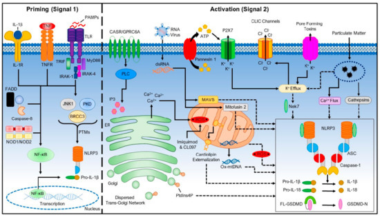 Pathways for NLRP3 inflammasome activation, illustrating priming (left) and activation (right). The interaction of particulate matter with these pathways is included in the upper-right corner (reproduced from Kelley et al., 2019 [10]).