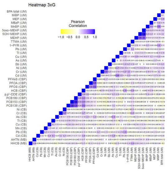 3xG: heatmap showing the Pearson correlations between all creatinine-standardised and lipid-standardised measured biomarkers measured in urine and blood, respectively, available for the selected subset of participants. Data were corrected for age, BMI, and smoking status of the participants. The matrices in which biomarkers were measured are shown between brackets (MB: maternal blood, CB: cord blood, CBP: cord blood plasma, UM: morning urine).