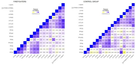 CELSPAC—FIREexpo: heatmap showing the Pearson correlations between serum PFASs and creatinine-standardised urinary OH-PAHs for firefighters (left) and the corresponding control group (right). Data were corrected for age and BMI.