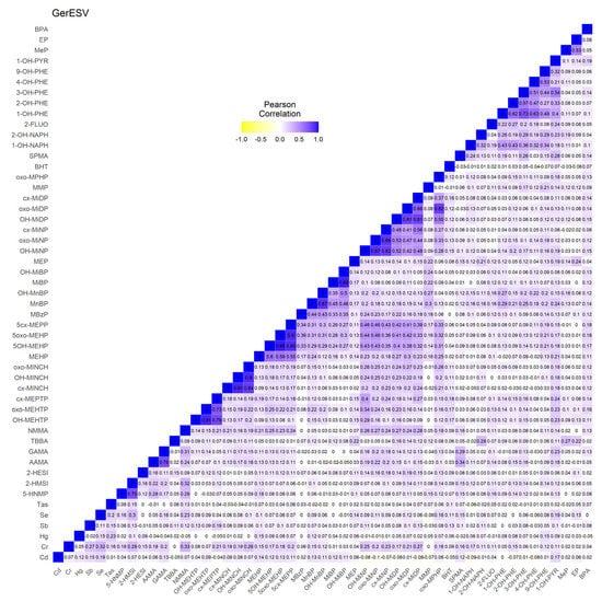 GerES V: heatmap showing the Pearson correlations between all measured creatinine-standardised biomarkers available for the selected subset of participants. Data were corrected for age, sex, body mass index (BMI), smoking status of the participant, and education of the household.