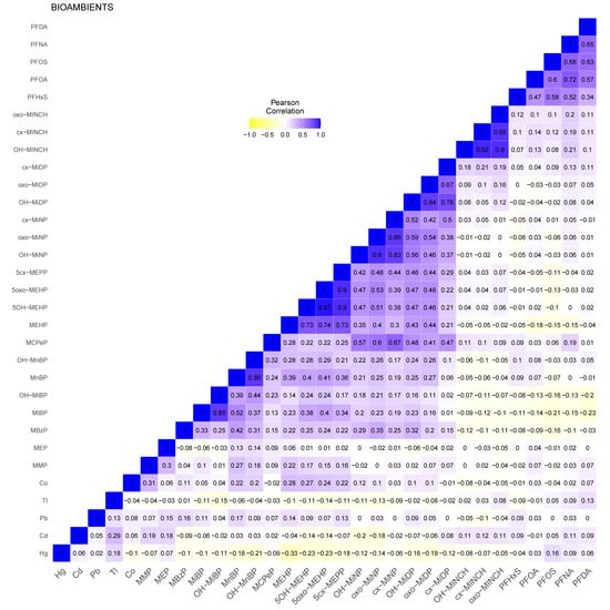 The selected subset of 163 participants had data on biomarkers for the following substances: metals, i.e., mercury (Hg), cadmium (Cd), lead (Pb), thallium (Tl), and cobalt (Co), phthalates (DMP, DEP, BBzP, DiBP, DnBP, DEHP, DiNP, and DiDP), DINCH, and PFASs (PFHxS, PFOA, PFOS, PFNA, and PFDA). As a result, a total of 31 biomarkers were included in the analyses. Metals and phthalates were measured in valid morning void urine and PFAS in blood. Missing values in biomarker data were imputed as described in the Materials and Methods section. Descriptive statistics for this set of biomarkers are shown in Table 1 and Table S4. Figure 4 shows the correlation heatmap for the biomarker included for BIOAMBIENT.ES, using data standardization for creatinine and corrected by age, sex, body mass index (BMI), and smoking status of the participant. The heatmap showed positive and negative, mainly small to medium correlations. The correlation among metabolites of the same group of substances showed higher positive correlations, except for metals and some phthalates such as MEP. In addition, some negative correlations were observed among PFAS or DINCH, and most of the phthalates. Mercury and thallium showed negative correlations with most biomarkers, except for PFAS.