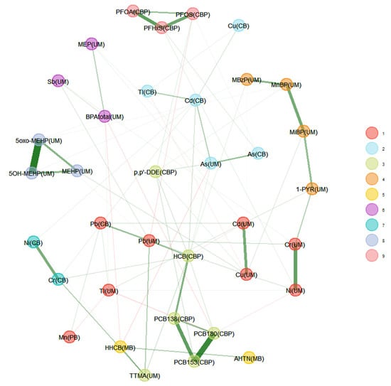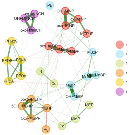 Figure 5 shows the weighted network for the 3xG subset of participants (n = 125). Biomarkers measured in urine are standardised for creatinine and lipid-soluble biomarkers in blood are standardised for lipids. Nine different communities were identified (represented by the different colours), with the strongest relations within the communities (thick lines). Negative correlations (red lines) were minimal. Green lines represent positive associations while red signify negative associations between biomarker levels. Communities with biomarkers originating from the same chemical group were detected, such as the musks (HHCB and AHTN, community 5 in yellow) or the heavy metals. The heavy metals were, however, split into three separate communities (numbers 1, 2, and 7 in Figure 5).