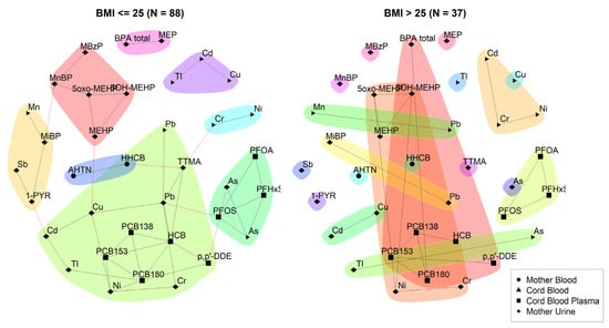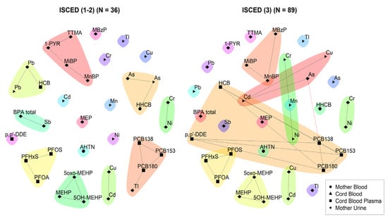 All participants agreed to fill in questionnaires during pregnancy and after delivery. Socioeconomic characteristics, such as the educational level of the household members, smoking habits, information on consumption of local food, and the course of pregnancy, were collected. A urine sample was collected in the second trimester of pregnancy. Birth weight, length, and head circumference of the baby at birth were collected with consent from the mothers. A blood sample of the mother and umbilical cord blood were collected at delivery and a questionnaire was filled in by the mothers at the same time point. Since not all biomarkers were measured in the same group of participants, we selected the biomarkers that ensure a subset with enough participants. Consequently, a subset of 125 mother–child pairs were included in the network analysis. Biomarkers included in the network analysis were corrected for age (in years), body mass index (BMI), and/or smoking status of the participant. Networks were stratified by education status; low ISCED (International Standard Classification of Education) is defined by participants belonging to educational levels 0–4, and high ISCED is defined by participants belonging to educational level ≥5.