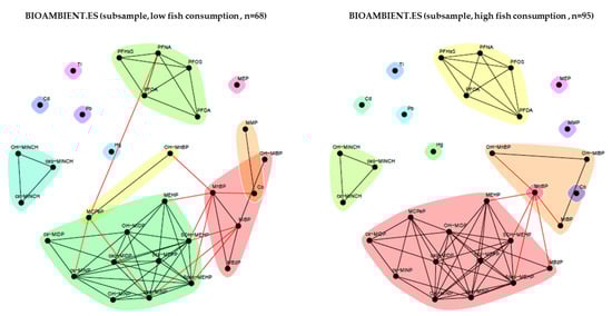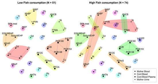 Further stratifications were explored in Figure 8 where networks are explored for participants with a low fish consumption (less than 1–3 times per week) and relatively high fish consumption (equal or more than 1–3 times per week). While some communities are conserved, such as the PFASs, DEHP metabolites, and urinary heavy metals (Cu, Cd, Cr, and Ni), some others show slight changes, especially regarding other heavy metals measured in the cord blood of the newborn at birth.